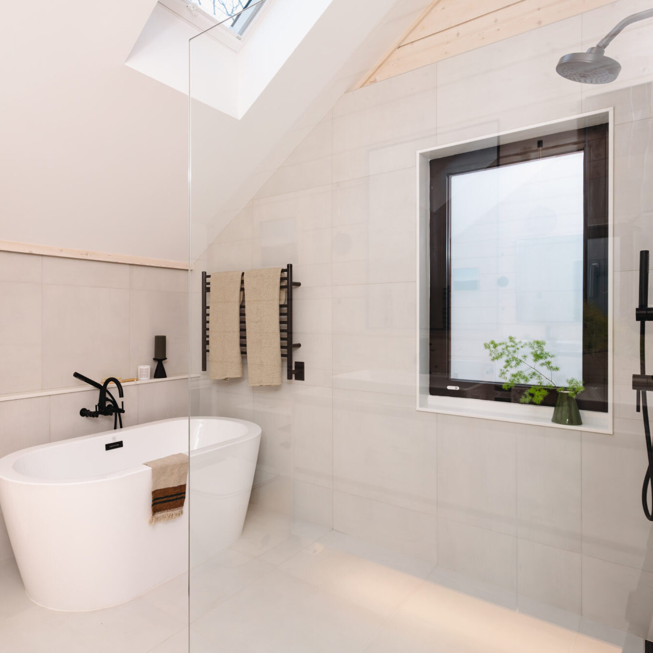 A first-floor bedroom with semi-private bath and laundry is perfect for friends and family. Following the stairs up to a second-floor balcony, the primary bedroom suite features a movable wall system that opens to a flexible loft space and a dramatic view. An ensuite, spa-like bath includes a free-standing soaking tub, walk-in shower, double floating vanity, and heated floors and towel rack, giving the feel of a bespoke, luxury, European hotel suite.