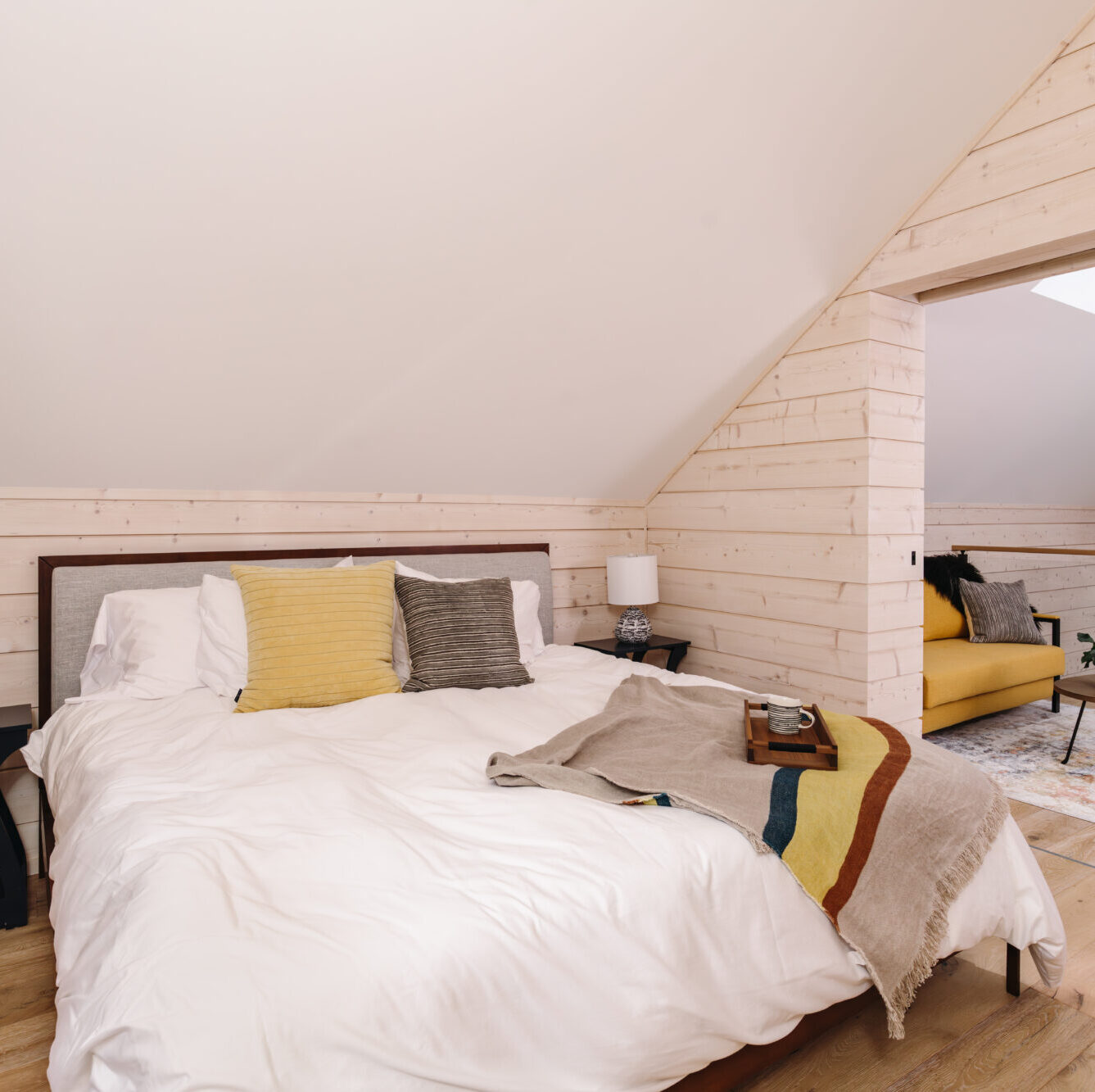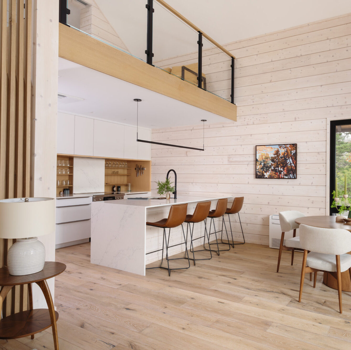 The entry to the Iniö has ample built-in storage, seating, and a large overhead skylight. It opens into a dramatic living space with a tall cathedral ceiling and a floor-to-peak glass wall. The inviting living space is accented by a sculptural modern fireplace. A comfortable dining area connects with a beautiful and efficient kitchen with custom cabinetry, premium appliances, and eat-in peninsula, adding a warm, cozy feeling to the Iniö.